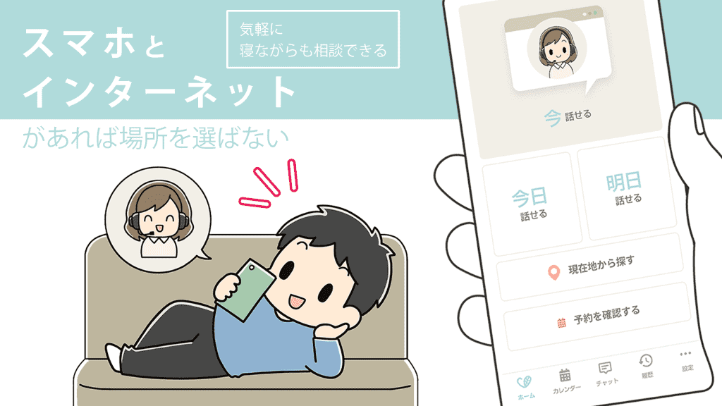 「今話せる」「今日話せる」「明日話せる」と相談を待っているカウンセラーとすぐにつながることができます。